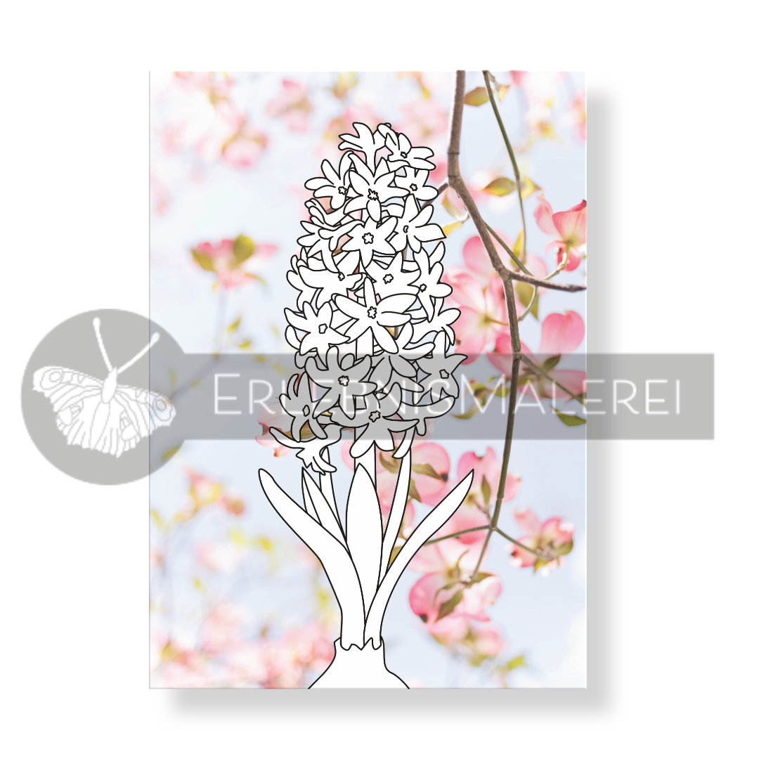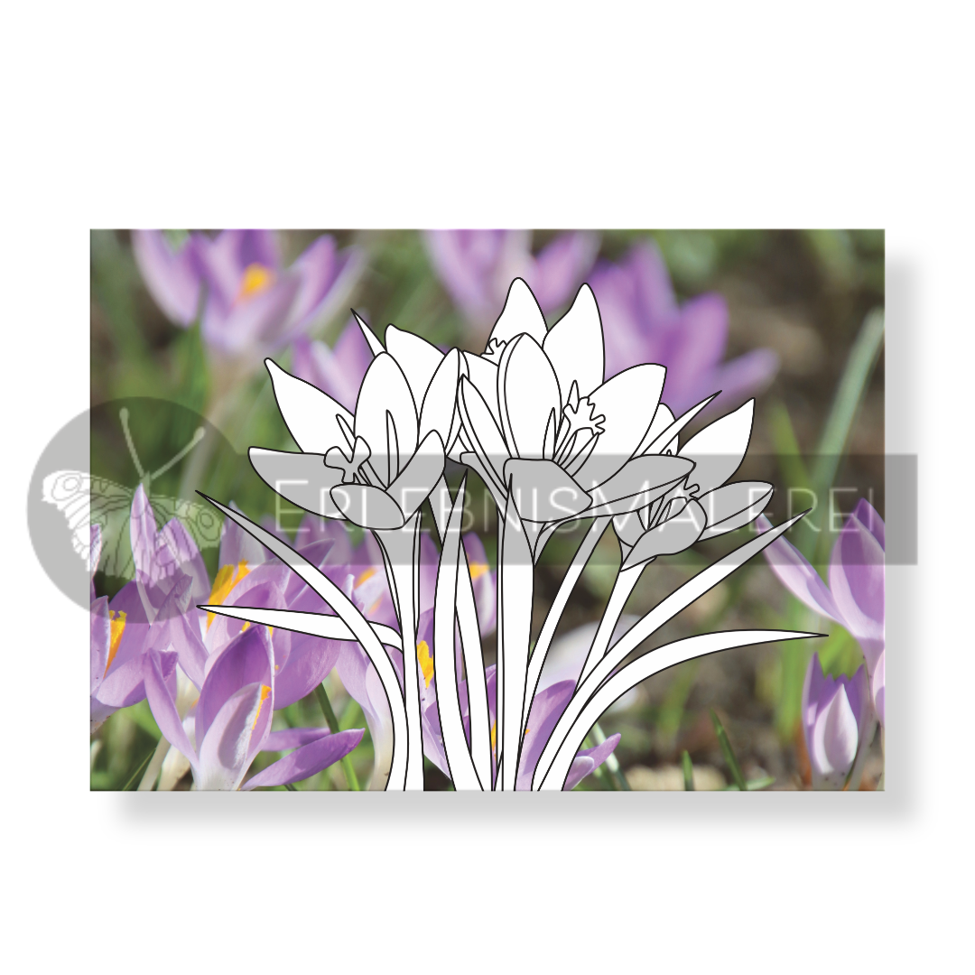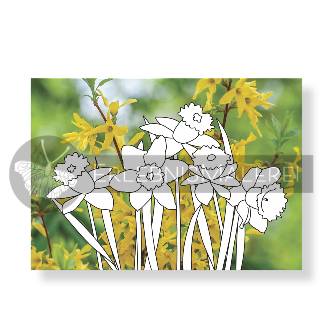 Jede Karte zeigt klassische Frühlingsblüher vor stimmungsvollen Naturfotografien: fliederfarben Krokusse im sanften Licht, ein prächtiger Weißling vor zarten Apfelblüten, leuchtend gelbe Narzissen zwischen Frühlingsgrün, zartrosa Kirschblüten am blauen Himmel und eine duftende Hyazinthe vor pastellfarbenem Bokeh. Die klaren Konturen laden zum großflächigen Gestalten mit Buntstiften, Filzstiften oder Aquarellfarben ein.
