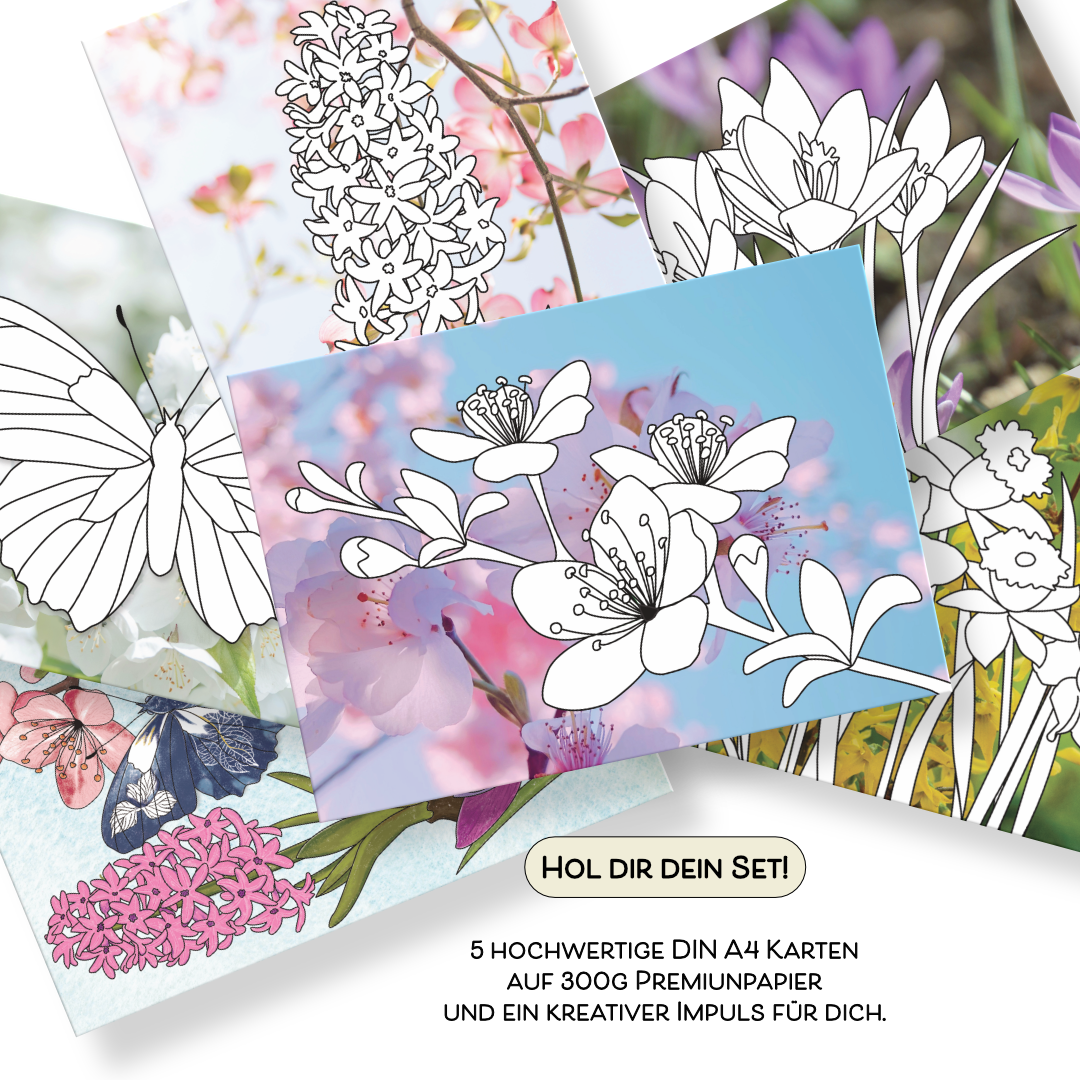 Wenn die Natur erwacht, lädt dieses Set aus fünf hochwertigen DIN A4 Karten auf 300g Premiumpapier dazu ein, den Frühling mit eigenen Farben zum Leben zu erwecken.